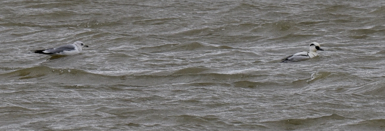 Goosanders belong to the family of fish eating saw-billed ducks and prefer bodies of fresh water. The very similar Red-breasted Merganzer is more likely to be found on our seas around the coast in the winter. The third species of sawbill that occurs regularly in Britain and the smallest of the three is the Smew. This is my favourite duck and one that each year becomes more difficult to see. It is a beautiful duck and the drakes are often nick-named white nuns! The photo shows one swimming near a Common Gull, so you can see how small and dainty they are.