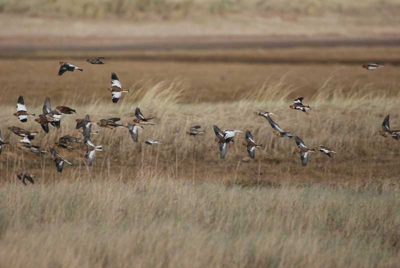 When you have had your fill of the wild goose chase, walk through the wood to the dunes and the bay beyond. Small birds are worth examining closely because in addition to the more usual Meadow Pipits, Skylarks and Linnets, you might find Rock Pipits, Twite, Snow Buntings and if you are really lucky perhaps a few Shore Larks.