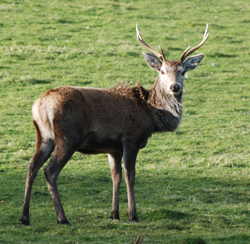 Although the Scottish Wild Cat occurs on the peninsula we failed to see it and we had not expected to encounter the other rare predator; the Pine Marten either. However the owner of the cottages said if we baited the terrace with Jaffa Cakes we might be lucky. We did this for two or three evenings and watched Robins and Blackbirds devouring the biscuits and Red Deer foraging within a few feet of the window but no Pine Marten. Then one evening before it was dark I caught sight of something large and russet slipping along the edge of the cottage. Could that have been it? I wasn't sure, but half an hour later, at dusk the Pine Marten leapt on to the table on the terrace and despite being aware of the four faces peering at it through the window, not to mention the light from flash guns, it indulged its passion for chocolate and orange flavoured biscuits.